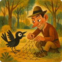 Once upon a time, in a sprawling woodland, there was a fowler who was busy weaving together a strange device. His nimble fingers moved in and out, twirling thin ropes. A curious Blackbird fluttered nearby and chirped, "What are you making?"
