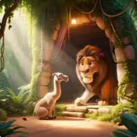 The camel was touched by their apparent selflessness and agreed to help. He walked to the lion's den, feeling scared but determined. He stood before the king and said, "My lord, I offer myself as food so that you can regain your strength."
