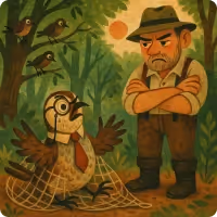 The Fowler looked at the Partridge with a stern gaze. He wasn't moved by the bird's plea. Instead, he said, "So, you are ready to betray your friends and family to save your own life. This makes me more certain that I should not spare you."
