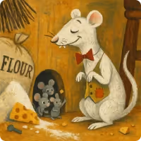 Seeing a sack of flour in a nearby mill, an idea sparked in his mind. "If I can't chase my meal, maybe I can trick it," he thought. So he decided to roll himself in the flour until he was entirely white, looking like a plump, juicy mouse.