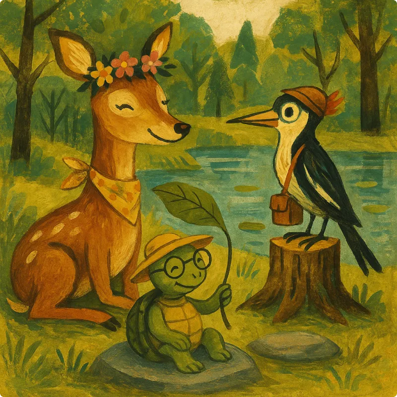 Once upon a...well, you know how these things start. In a forest, greener than broccoli on your plate, three buddies lived. There was Deer, always prancing around as if playing hopscotch. Woodpecker lived up in her tree house, always tap-tap-tapping, probably trying to invent a new dance. And Turtle? Just floating about in his lake, taking life one lazy swim at a time.